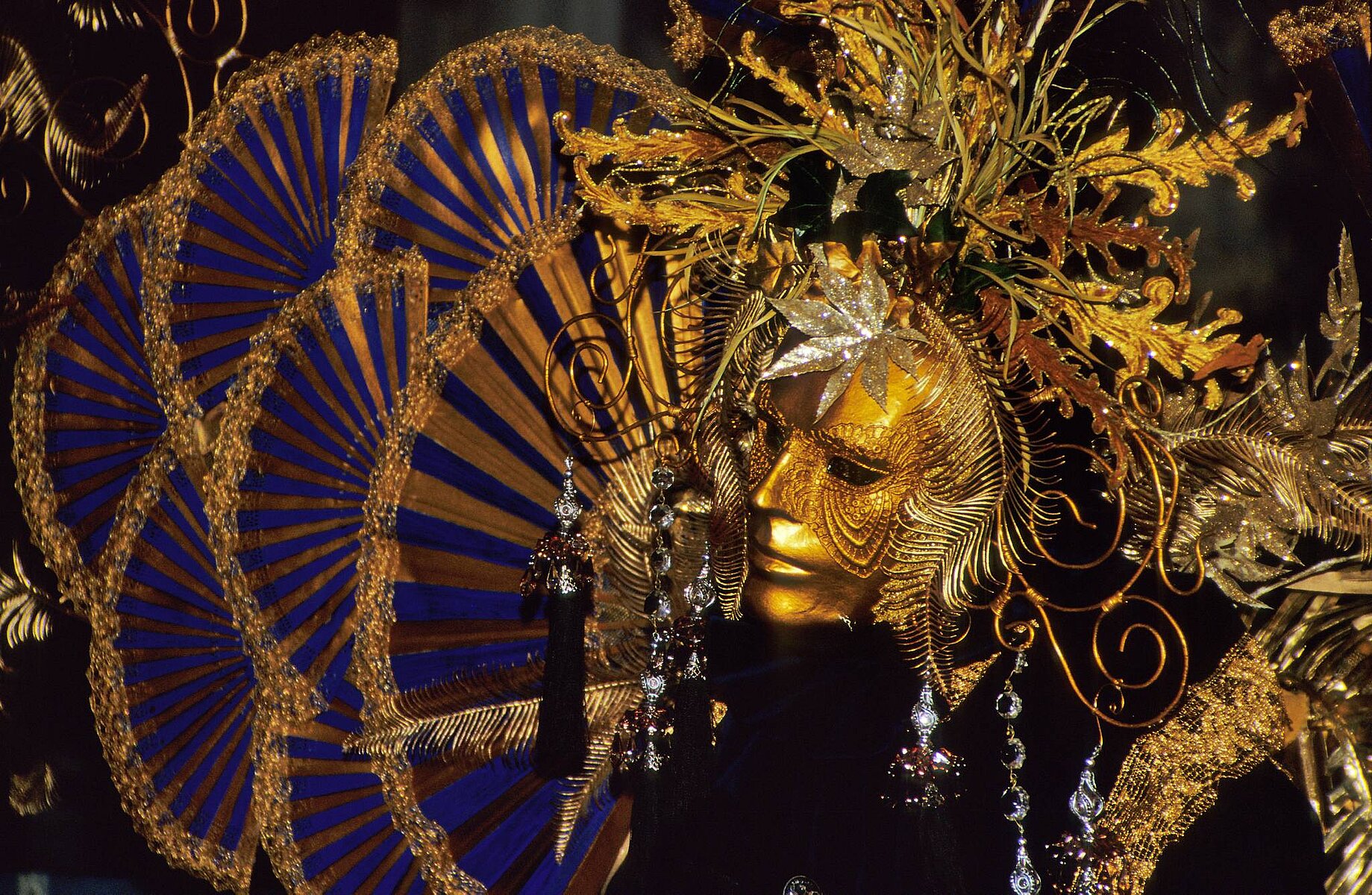 Goldmaske mit Blauen Fächern nah